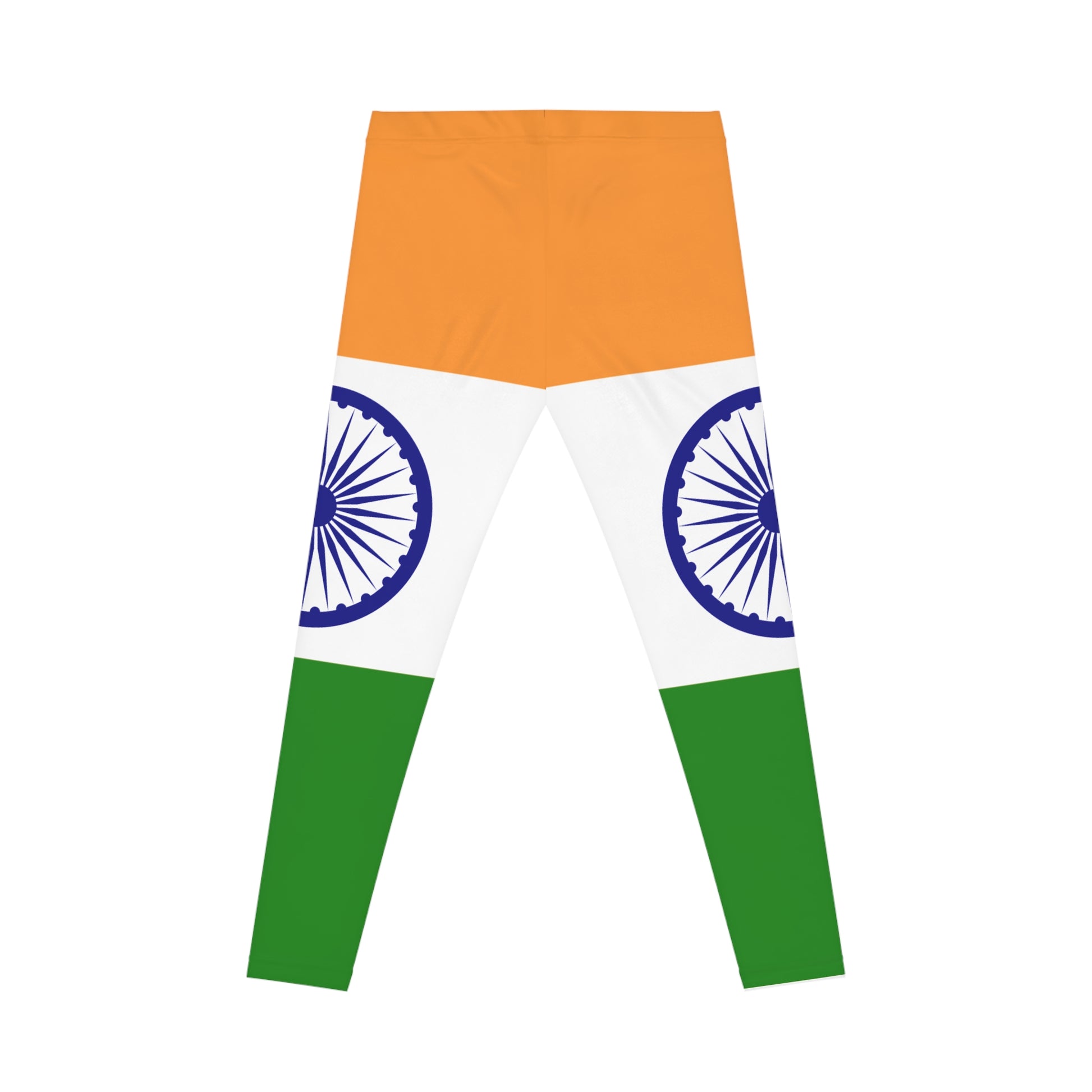 These full-color leggings bring bold, patriotic energy to everyday wear. Smooth, silky fabric wraps the legs in bright saffron, white, and green panels with a crisp navy wheel motif — vibrant printing that keeps its clarity stretch after stretch. The mid-rise elastic waistband sits comfortably for casual days, morning walks, or layered looks for festivals and cultural gatherings. Lightweight and flexible, they move with you whether you’re dancing at a celebration, running errands, or relaxing at home. The printed size and care inside the waistband and true-to-size fit make them easy to grab and wear without fuss.