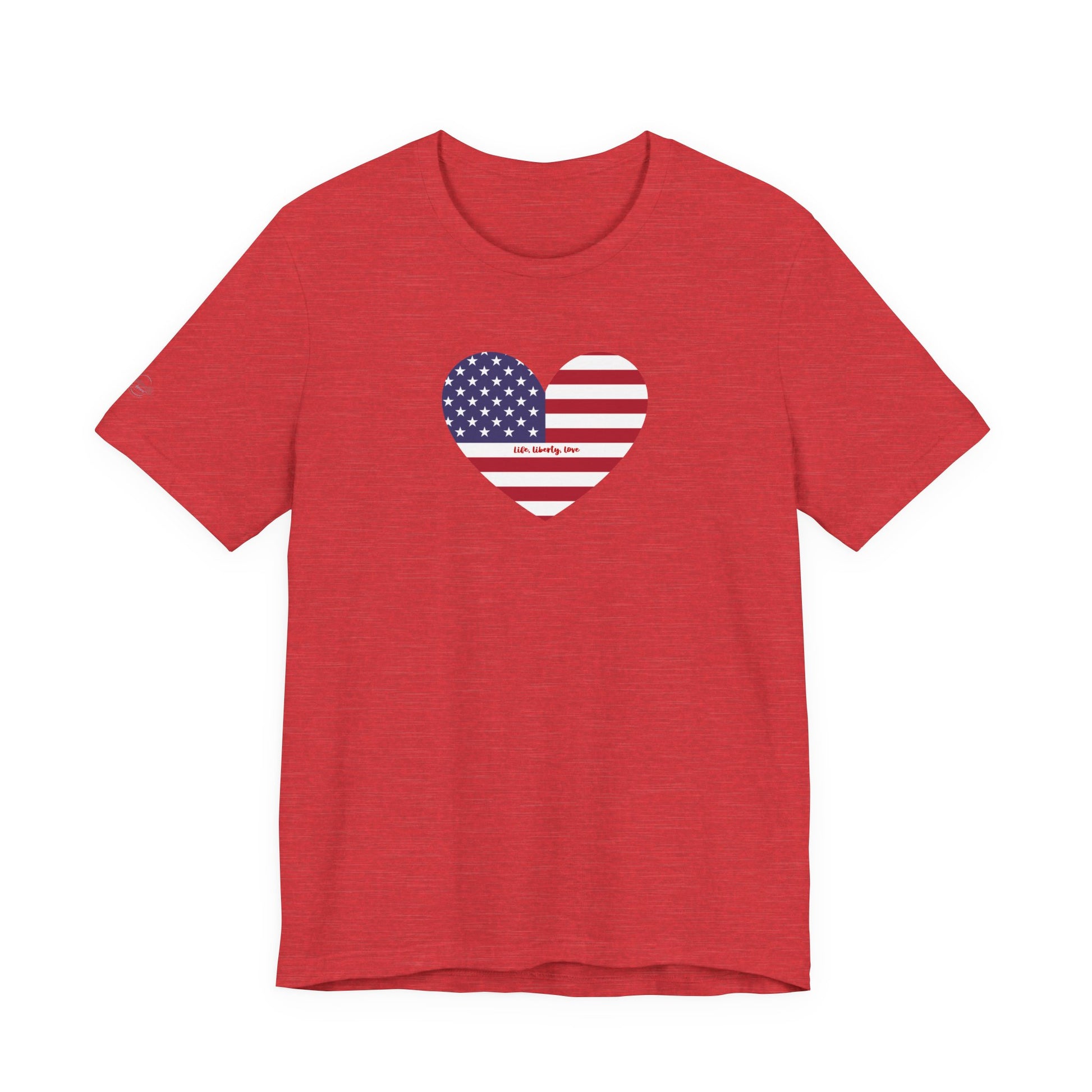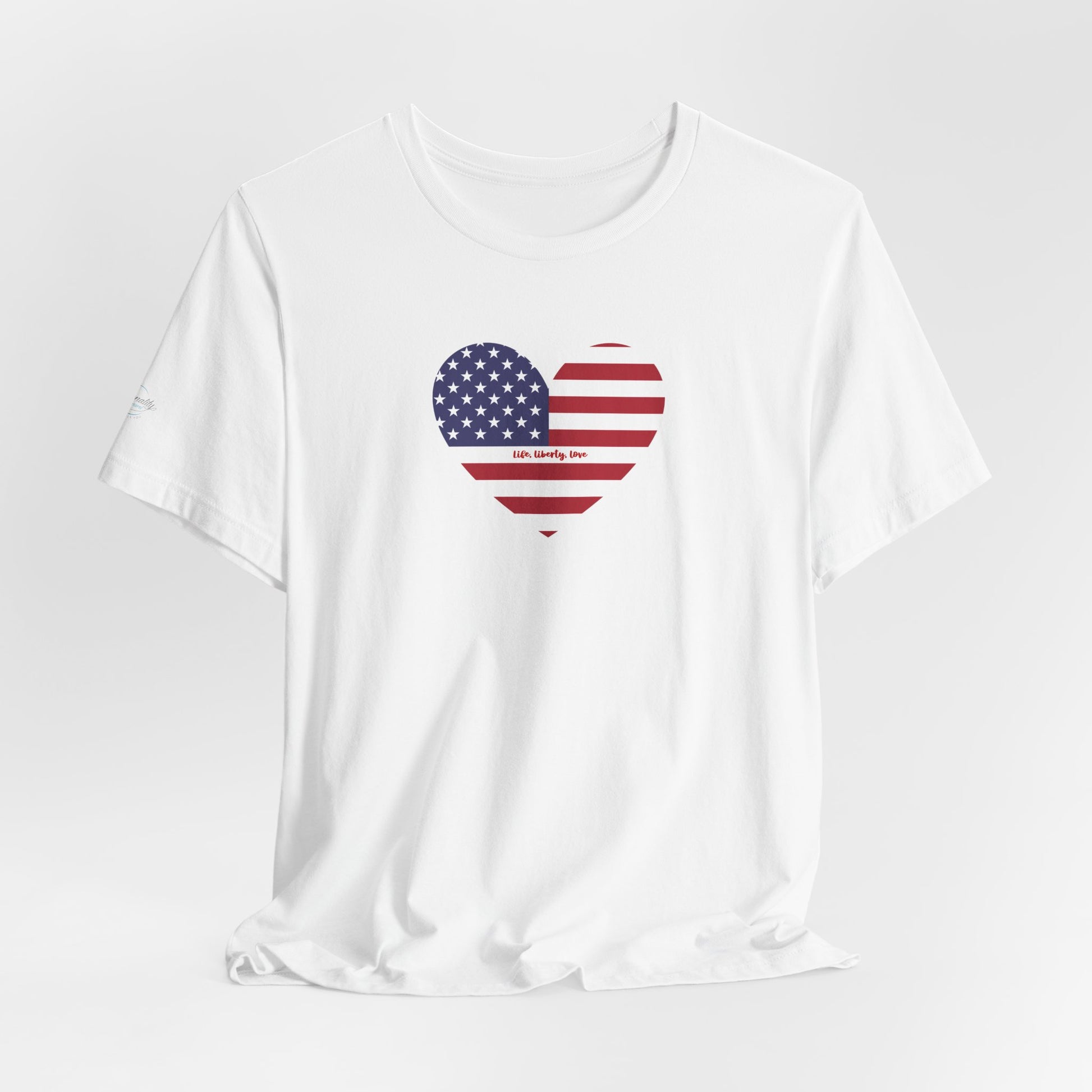 A short-sleeved Tee for women featuring a heart decorated in the American Flag with the words Life, Liberty, Love. Gives a patriotic vibe, perfect for everyday wear.